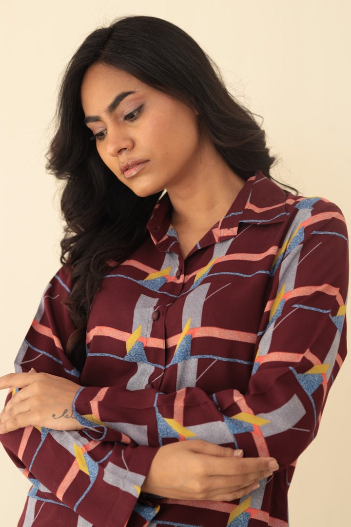 Women's Longline Burgundy Geometric Print Shirt